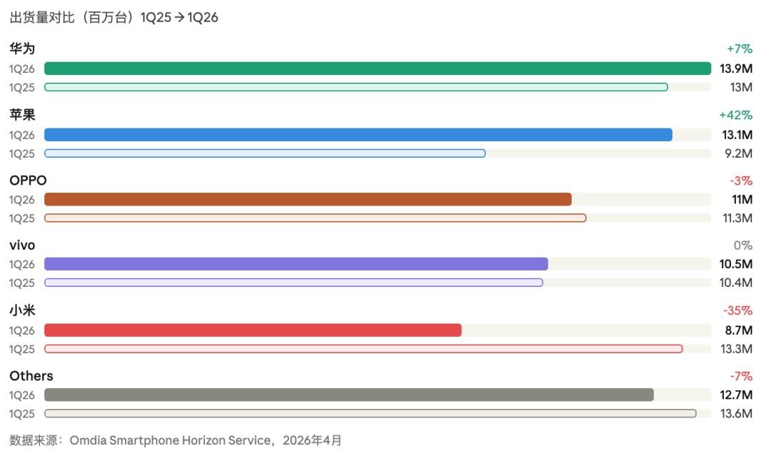 苹果Q1出货1310万台,同比增长42%,从1Q25的920万跳到1310万。这是一个让所有国产品牌都不好受的数字。