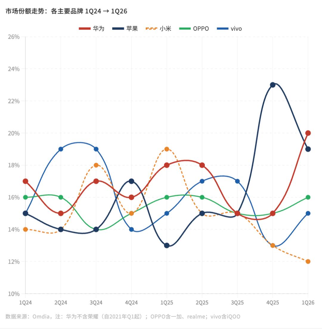 图:手机市场份额走势:各主要品牌 1Q24 → 1Q26