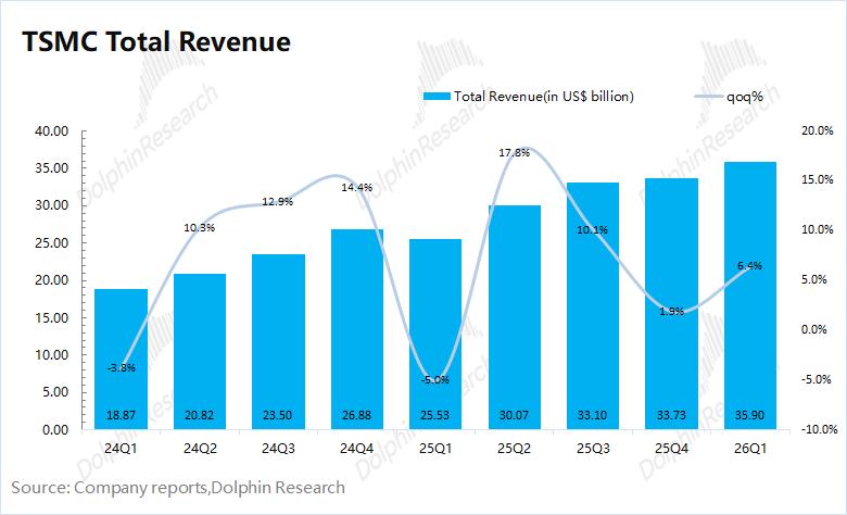 台积电在2026年第一季度实现营收359亿美元, 好于此前指引区间(346-358亿美元)。本季度收入环比增长6.4%,主要受AI芯片需求增长的推动,当前逐步从5nm转移至3nm平台。