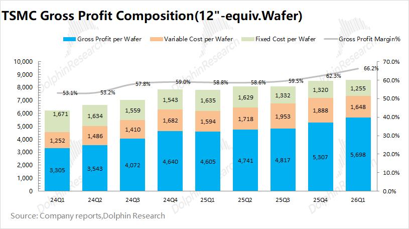 台积电在2026年第一季度实现毛利238亿美元,环比增长13%。其中毛利率66.2%,环比提升3.9pct,接近上调后市场预期(66-66.5%),受均价提升和单位成本下降的双重影响。