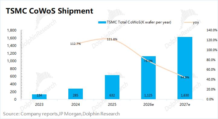 结合行业数据及市场预期,台积电目前CoWoS的月产能约8万片左右,至2026年末有望扩大至12万片左右。海豚君预估2026年台积电CoWoS的出货量有望达到110万片以上,同比增长77%,其中英伟达和博通是最主要的客户。