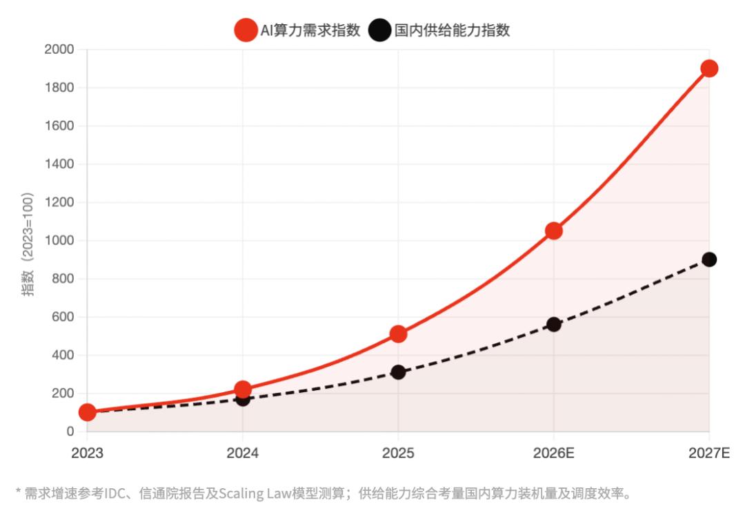 图|中国高性能AI算力:需求增速 vs. 国内供给能力扩张速度 指数:2023年=100 | 供需缺口持续扩大是此次涨价的底层逻辑