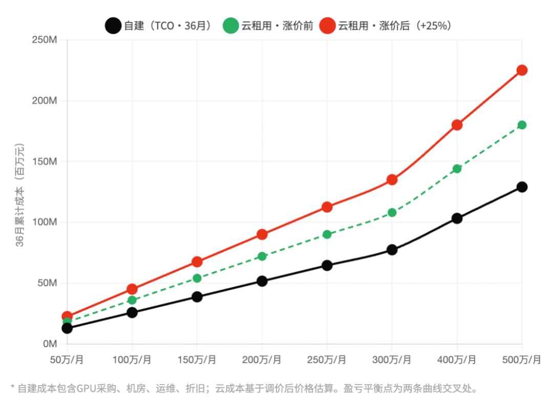 横轴为月均算力支出(万元/月),纵轴为36个月累计成本(百万元)| 涨价前后对比