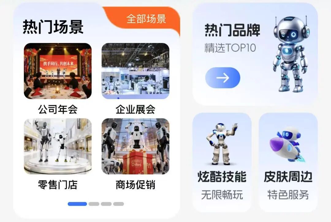 这样的情绪价值从春晚机器人表演中就可以略窥一斑,在擎天租平台上的热门场景中,就是公司年会、企业展会、零售门店、商场促销这些场景应用。