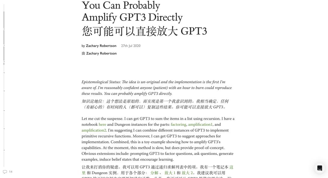 当时还是计算机系学生的 Zach Robertson,同样通过玩《AI Dungeon》接触了 GPT-3,并在 2020 年 9 月在 LessWrong 上发表了博客,详细记录了如何将问题「拆解为多步骤并链接起来」放大模型能力。