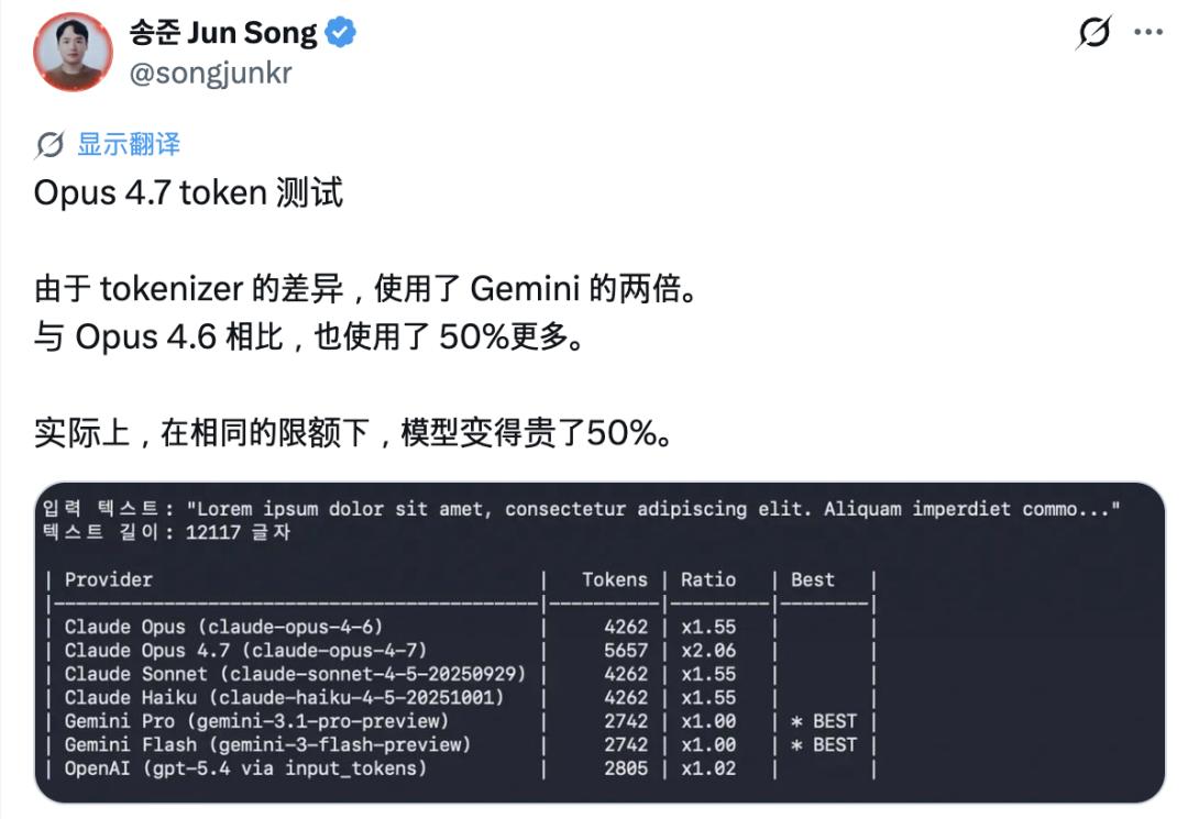 最扎眼的槽点,是 token 先「通货膨胀」了。新版引入了全新的 tokenizer(分词器),同样一段文字,拆出的 token 数量比以前多出 1.0 到 1.35 倍。不少用户反映,还没聊几句,额度就见了底。