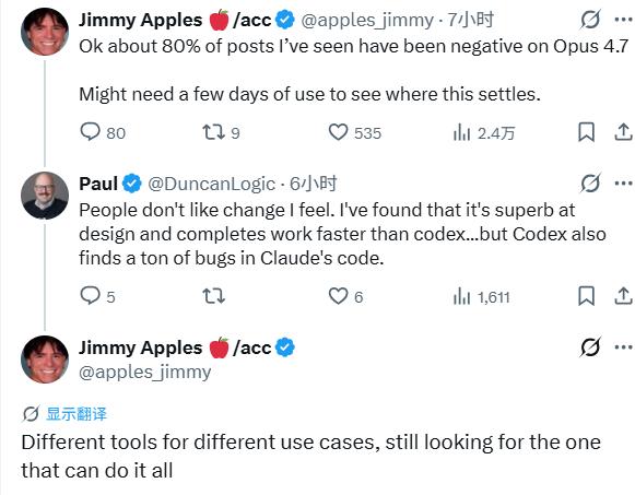 知名爆料人@apples_jimmy观察到,由于Anthropic此前对AGI(通用人工智能)概念的长期预告,导致用户对Opus 4.7的期望值过高,这种“炒作后的失望”在社交媒体上占据了约80%的负面评论。