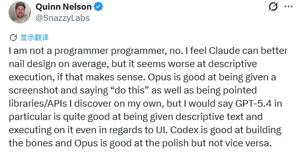 在真实的编程环节,用户@SnazzyLabs总结出了一个精准的差异:Claude的Opus擅长“打磨”和抓住设计精髓,但在根据描述性文本执行具体任务时,GPT-5.4支持的Codex则表现得更出色 。