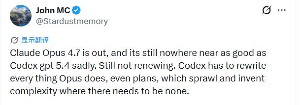 用户 @Stardustmemory 说得更重,Opus 4.7 在本该简洁的地方凭空制造复杂性,导致他甚至不想续订,因为 Codex 往往能更高效地重写 Opus 做的计划。