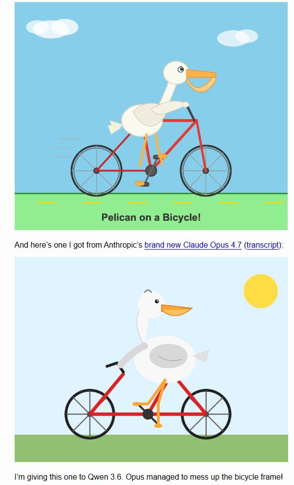 再看手感。 软件工程专家 Simon Willison 做了个极具传播力的测试:让 Opus 4.7 生成一张“骑自行车的鹈鹕”SVG,结果 4.7 连自行车架的基本形状都画砸了,甚至输给了在笔记本本地跑的小参数模型 Qwen。威利森调侃道,虽然这只是个玩笑,但它确实打破了“模型越贵、画画越好”的迷信。