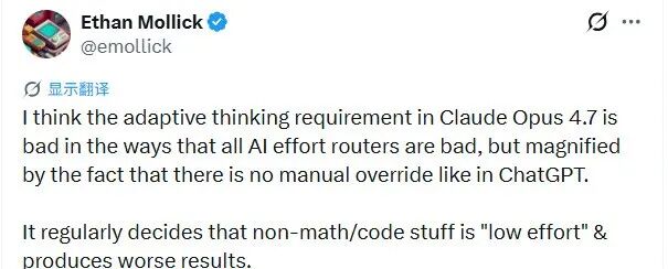 沃顿商学院教授 Ethan Mollick 还提出了一个更尖的批评,他发现 Opus 4.7 的“自适应思考”机制存在偏见:它倾向于把非代码、非数学任务默认成“低努力”档,在分析、写作、研究这些场景里直接“偷懒”,产出质量甚至不如前一代。
