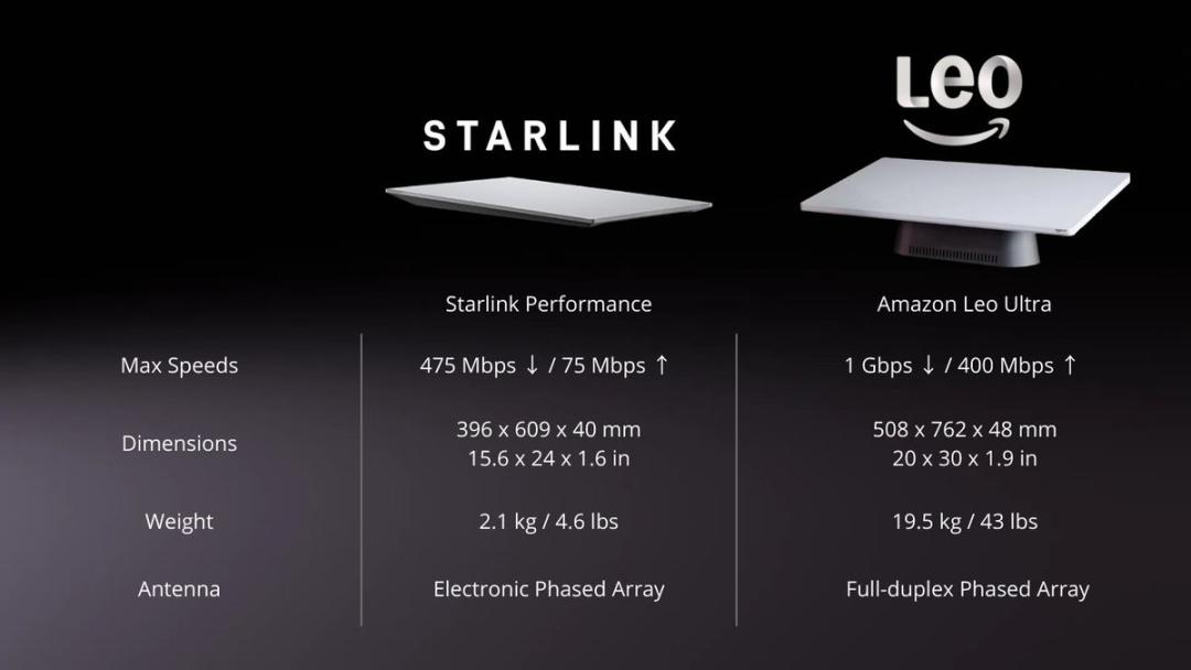 面对这一局面,贝佐斯的策略是绕道而非硬攻。Amazon Leo将轨道高度定在590至630公里,比Starlink的340至570公里略高,覆盖面积更广,但信号强度存在一定损耗。为了弥补这一差距,Leo天线采用了更大的相控阵面积和更高效的自研芯片,最终在商业产品层面实现了超越Starlink峰值速率的账面成绩。