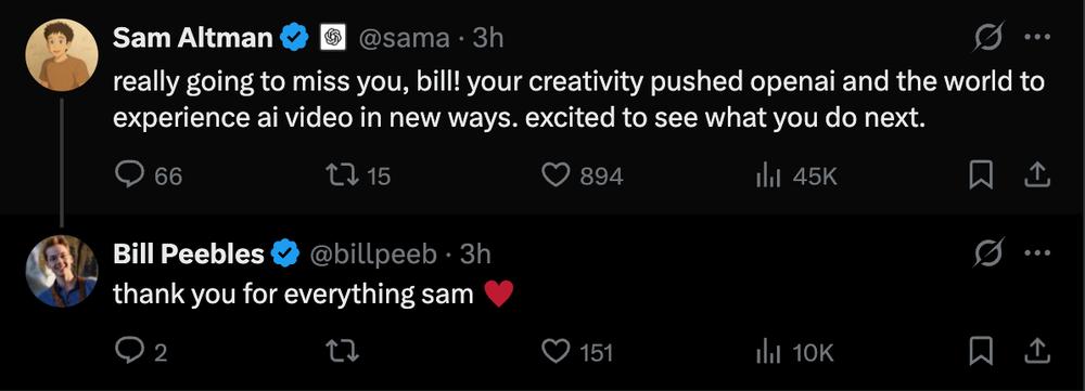 萨姆·奥尔特曼随后在评论区回应称,将“非常想念Bill”,并表示其创造力推动OpenAI乃至整个行业以全新的方式体验AI视频,同时也期待他接下来的动向。Bill随后回复称“感谢一切”。