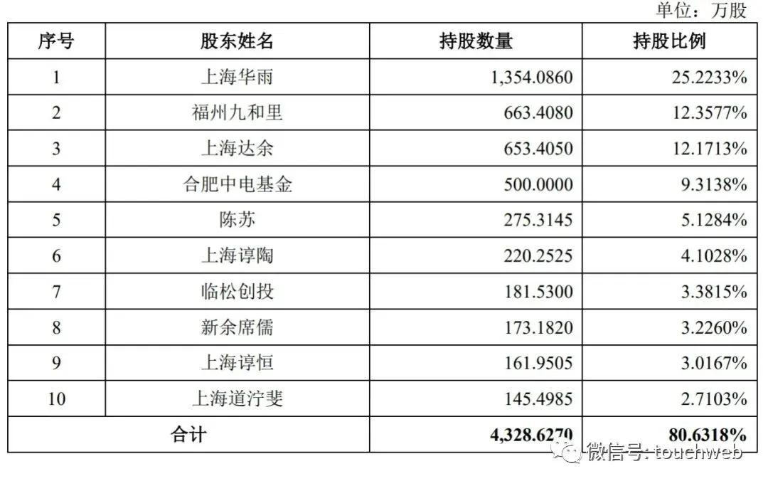 福州九和里持股为12.3577%,上海达余持股为12.1713%,合肥中电基金持股为9.3138%,陈苏持股为5.1284%,上海谆恒持股为3.0167%,上海道泞斐持股为2.7103%。