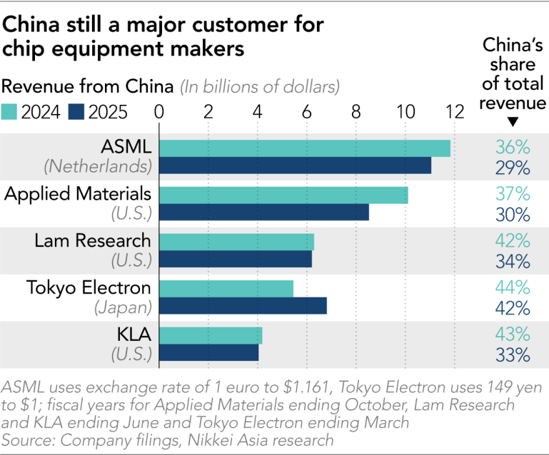 尽管进口下降,中国市场去年仍是美国主要芯片设备厂商的重要收入来源。应用材料(Applied Materials)、泛林集团(Lam Research)和科磊(KLA)在2025财年均有超过30%的收入来自中国。