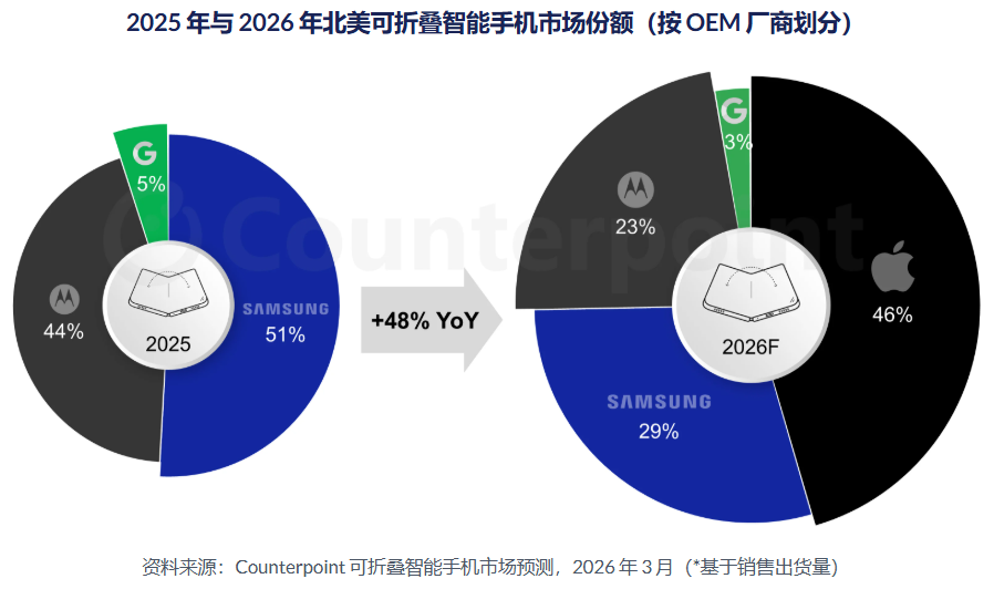 4月14日,市调机构Counterpoint Research在报告中指出,2026年北美可折叠智能手机市场将同比增长48%,苹果有望在进入该领域的第一年就占据46%的市场份额,从而重塑市场需求格局,并重新分配现有厂商的市场份额。这一转变预计将对近期在该地区获得市场份额的厂商构成压力,尤其是谷歌和摩托罗拉。