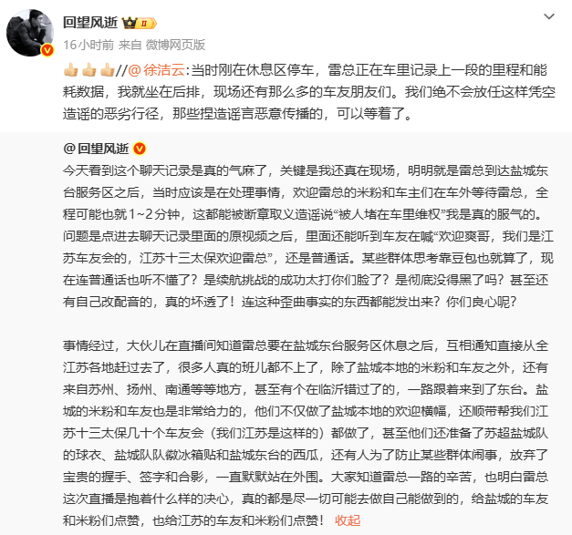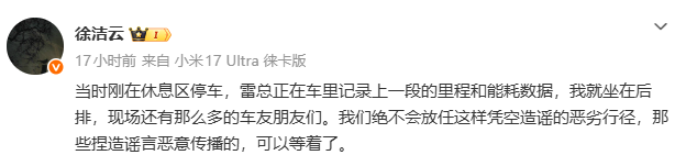 徐洁云在回应中明确表示:“当时刚在休息区停车,雷总正在车里记录上一段的里程和能耗数据,我就坐在后排,现场还有那么多的车友朋友们。”他同时严正警告造谣者:“我们绝不会放任这样凭空造谣的恶劣行径,那些捏造谣言恶意传播的,可以等着了。”