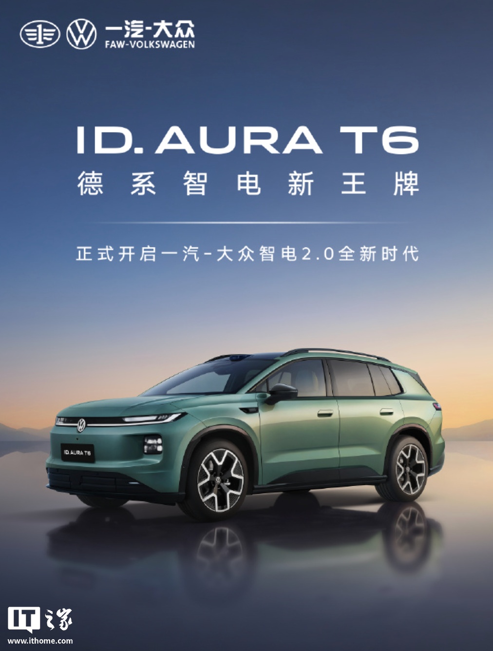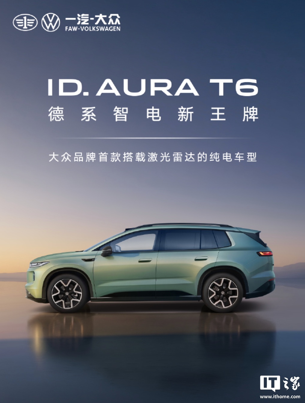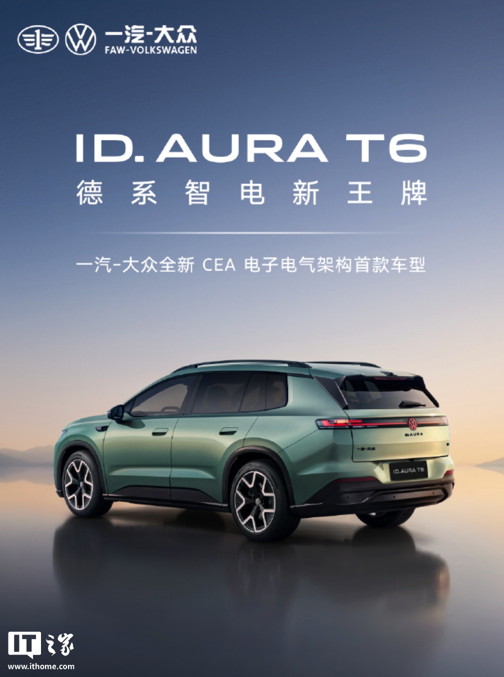 IT之家 4 月 21 日消息,在大众汽车集团媒体之夜上,一汽-大众 ID.AURA 序列首款车型 ID.AURA T6 正式亮相,该车是一款“全新五座中型 SUV”,同时官方预热 ID.AURA 序列今年还将先后有两款车落地。
