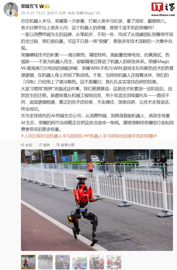 不过说是意外,其实也在情理之中。荣耀终端股份有限公司产品线总裁方飞事后也发文谈及了荣耀第一次参赛亦庄机器人半马霸榜前六这一成就。方飞介绍,荣耀技术的积累(液冷散热、精密结构、高能量密度电池、仿真测试、热插拔等)不是为机器人而生,却都精准迁移进了机器人的研发体系。当其他机器人还背着冰块,荣耀的「闪电」已经用上了液冷散热,是扎扎实实坚持自研的结果。