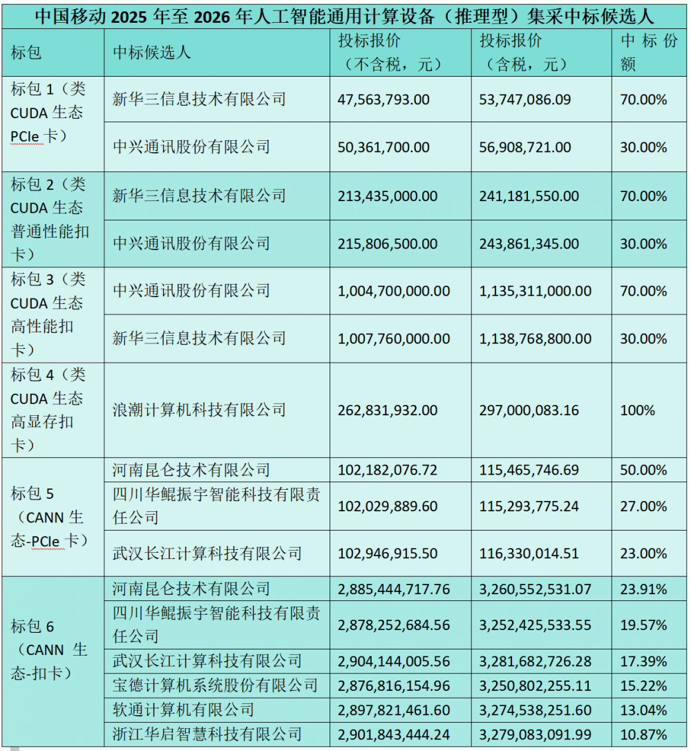 其三也是最重要的一点:两大设备商战略投资AI,成为算力基础设施的主力供应商,以及AI产业赋能的重要一环。例如最新中国移动的AI推理型设备集采,华为昇腾成为芯片最大赢家;中兴AI服务器中标份额最大。