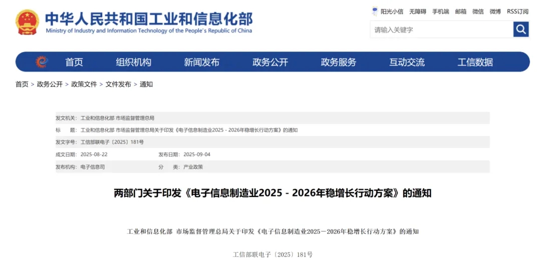C114讯 9月9日消息(兰茜)近日,为保持电子信息制造业经济运行在合理区间、为工业经济稳增长提供有力支撑,工业和信息化部、市场监督管理总局印发《电子信息制造业2025-2026年稳增长行动方案》(以下简称《方案》)。