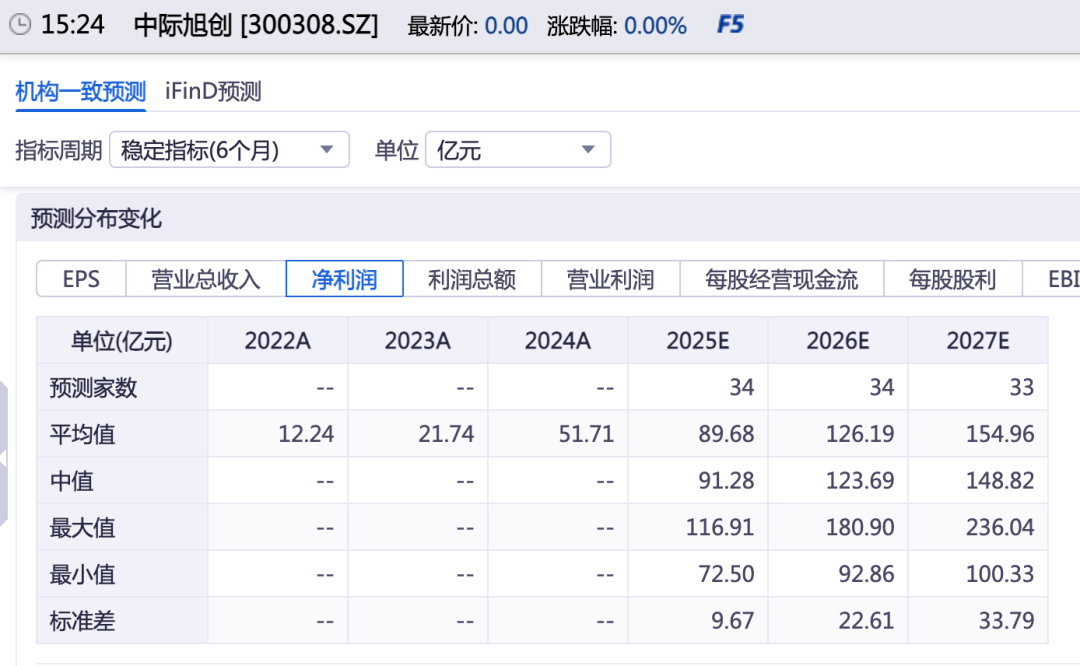 同花顺iFind数据显示,综合近6个月内33家机构的预测,中际旭创2027年的净利润预测平均值为154.96亿元、最大值为236.04亿元、最小值为100.33亿元。