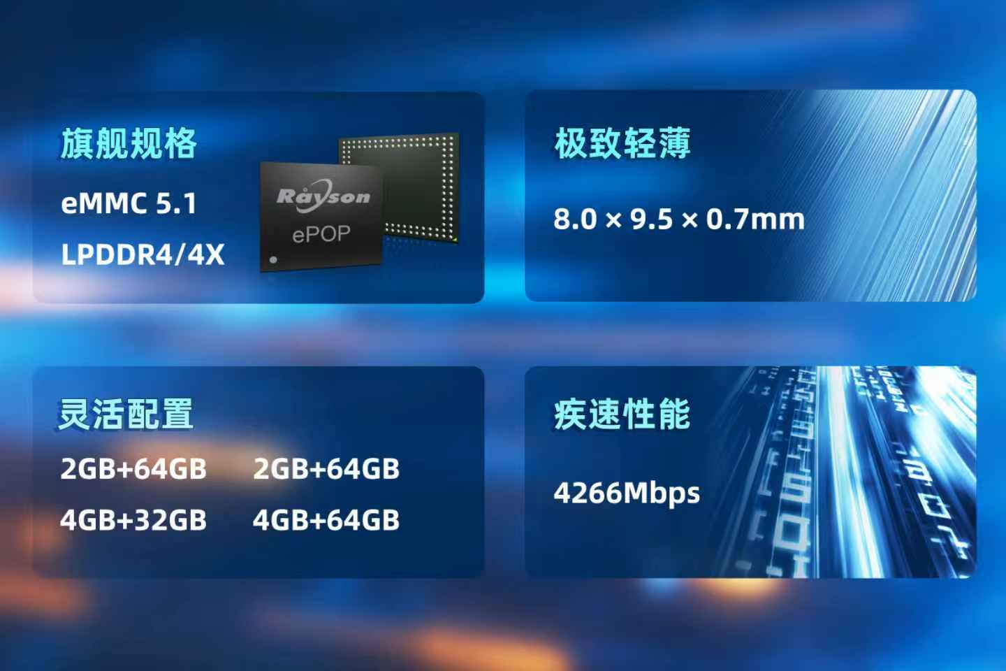 ePOP 存储芯片采用先进的 POP(Package on Package,层叠式封装)技术,整体尺寸仅 8.0 mm × 9.5 mm,厚度最薄可达 0.7 mm,相比传统分立式存储方案大幅缩小。这样“指甲盖般”的微小体积,不仅精准契合智能穿戴设备对内部空间的极致要求,也为终端厂商在外观设计与结构堆叠上释放更多可能。
