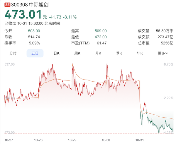 可以看到,10月30日和31日两天,中际旭创股价下跌9%,市值蒸发了530亿元;新易盛股价下跌了15%,市值蒸发了614亿元;天孚通信股价下跌了19%,市值蒸发了284亿元。