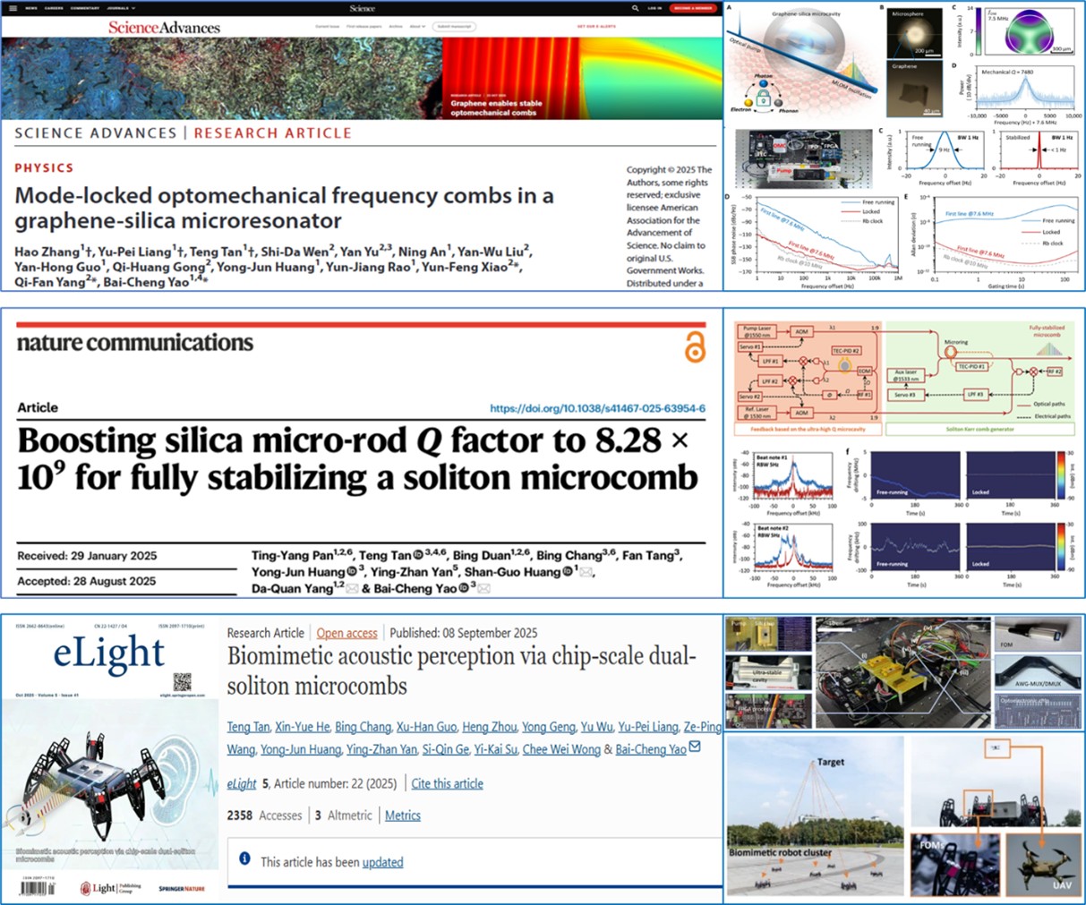 在发表于Science Advances的研究论文中,电子科技大学与北京大学、美国加州理工大学合作,提出了一种复合微腔结构新方案,通过光子、电子和声子的交叉调控,在100GHz重频的光学腔中激发了MHz级重频的锁模光机频率梳,进而展现了与铷原子钟相当的频率稳定度,全系统能够封装在厘米级尺度的紧凑模块中,为光子-射频传感解调提供了新的标定工具。团队博士生张浩、梁瑜佩和青年教师谭腾副教授为论文共同第一作者,电子科技大学姚佰承教授和北京大学肖云峰教授、杨起帆教授为论文共同通讯作者。该论文入选Science Advances当期高亮论文(共3篇)。