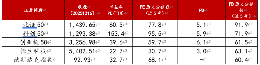 将创50与北证50、科创50等科创类指数进行比较可见,当前科创50 PE 153.4倍,是各类指数中PE最贵的,北证50其次,创50居中,亦高于纳指及恒生科技。