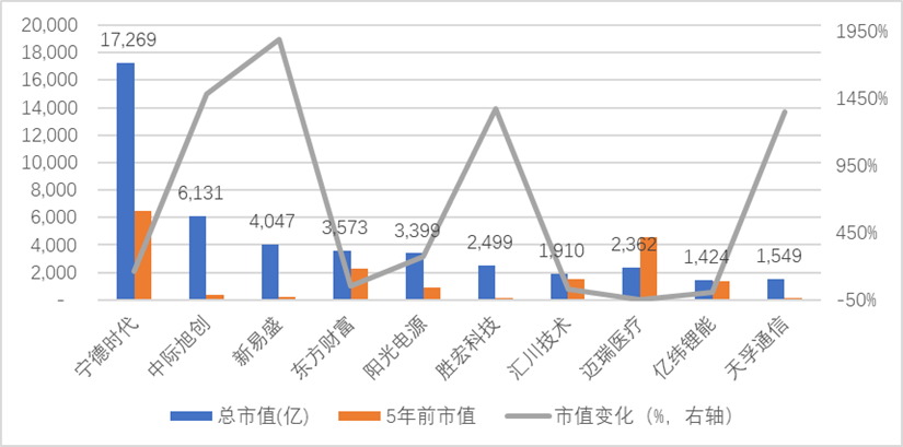 从前十大成分股来看,宁德时代一骑绝尘,当前市值1.7万亿元,较5年前增长1.65倍。市值增幅超10倍的包括中际旭创、新易盛、胜宏科技及天孚通信,均为信息技术类。