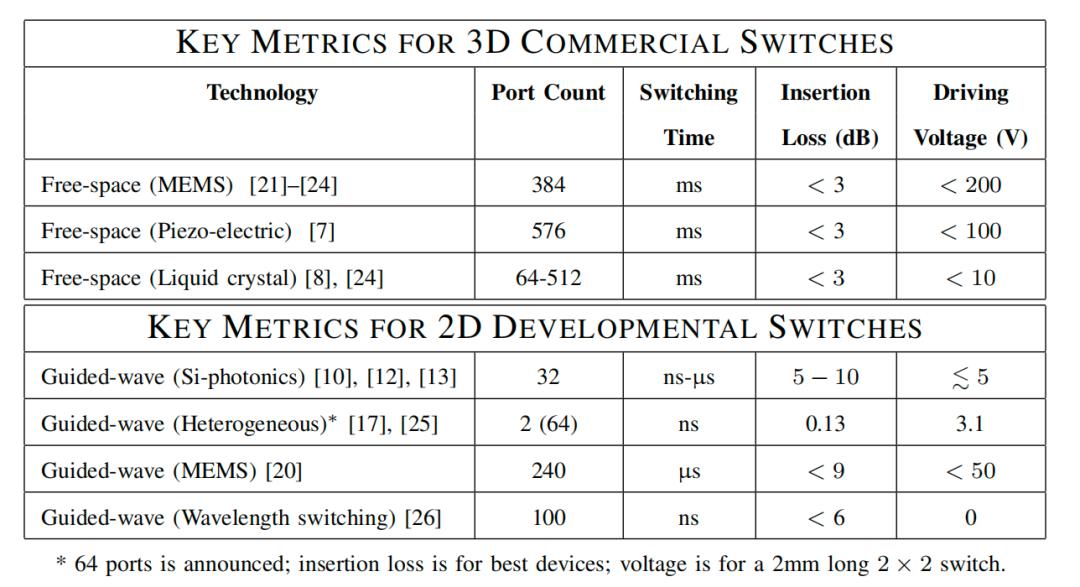 表 I 列出了用于商用和研发型光电路交换机(OCS)的多种器件技术的四个关键性能指标。这些指标取决于交换功能是基于空间还是基于波长实现的,以及交换功能是在自由空间中的三维结构中实现,还是在平面内的二维结构中实现。