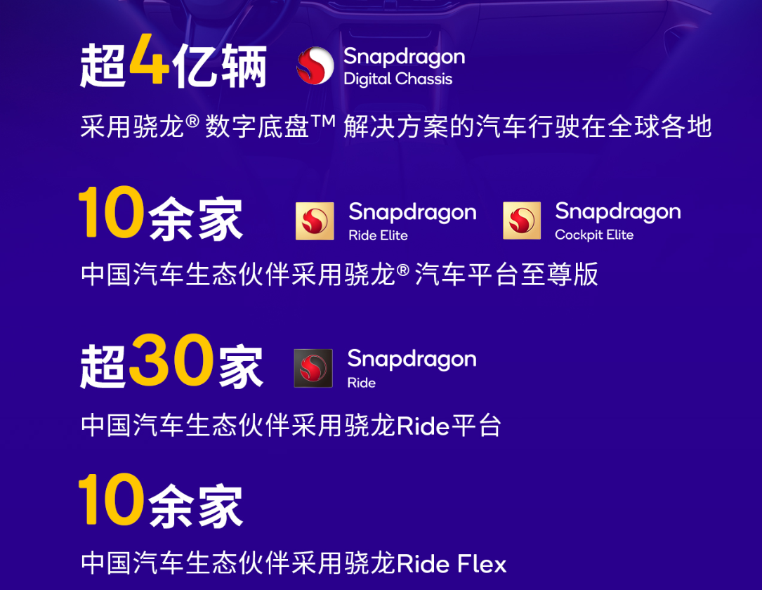 目前,全球已有超过4亿辆汽车采用骁龙数字底盘解决方案。高通在车载信息娱乐和座舱SoC解决方案领域全球排名第一,全球已有超过7500万辆汽车采用骁龙座舱平台,其中也包括来自中国市场的众多车型。