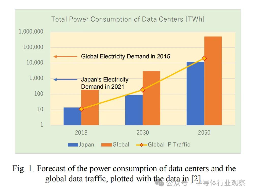 近年来,生成式人工智能的迅猛发展导致全球范围内超大规模人工智能集群的部署速度空前加快。随着摩尔定律的放缓,只有通过并行计算才能实现更高的性能,因此,数据处理和/或传输性能的提升必然导致能耗的增加。也就是说,人工智能基础设施的快速增长带来了严重的能源危机。如图 1 所示,随着数据量的指数级增长,所需的能源供应量也将呈指数级增长。从这个意义上讲,解决这一能源问题的唯一有效途径是开发一种能够将能源增长与数据增长分离的技术。