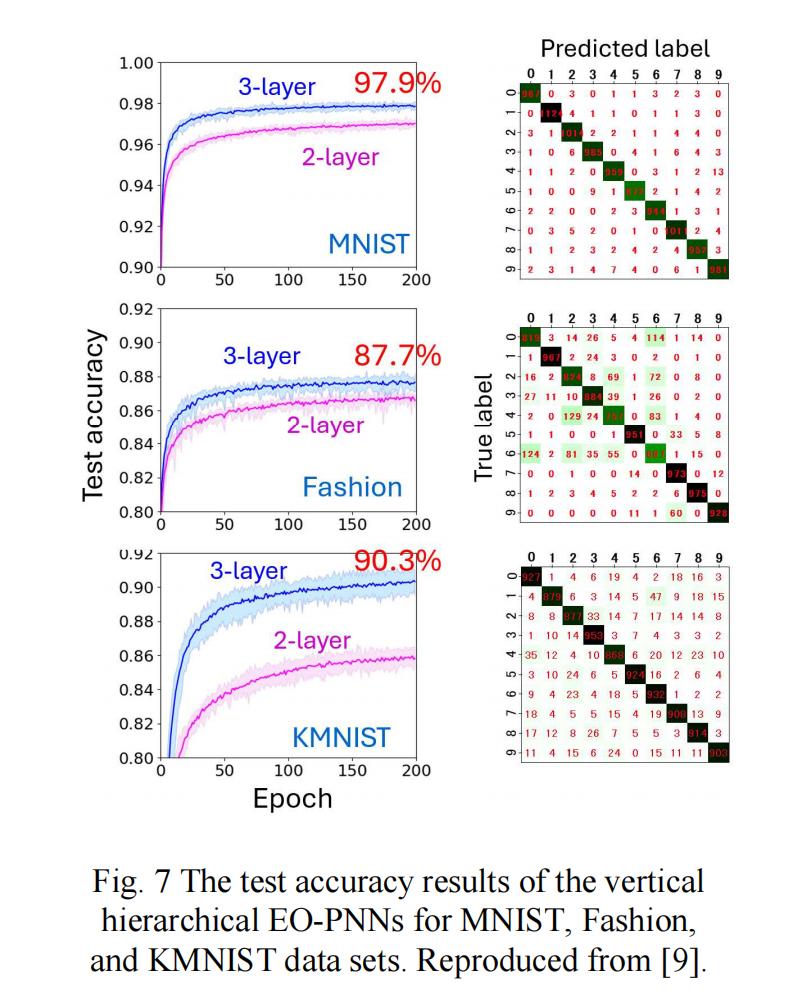 图 7 显示了 MNIST、Fashion 和 KMNIST 数据集的测试准确率。三层模型的准确率优于两层模型。我们在此介绍的最后一个(但同样重要)模型是光电霍普菲尔德网络。
