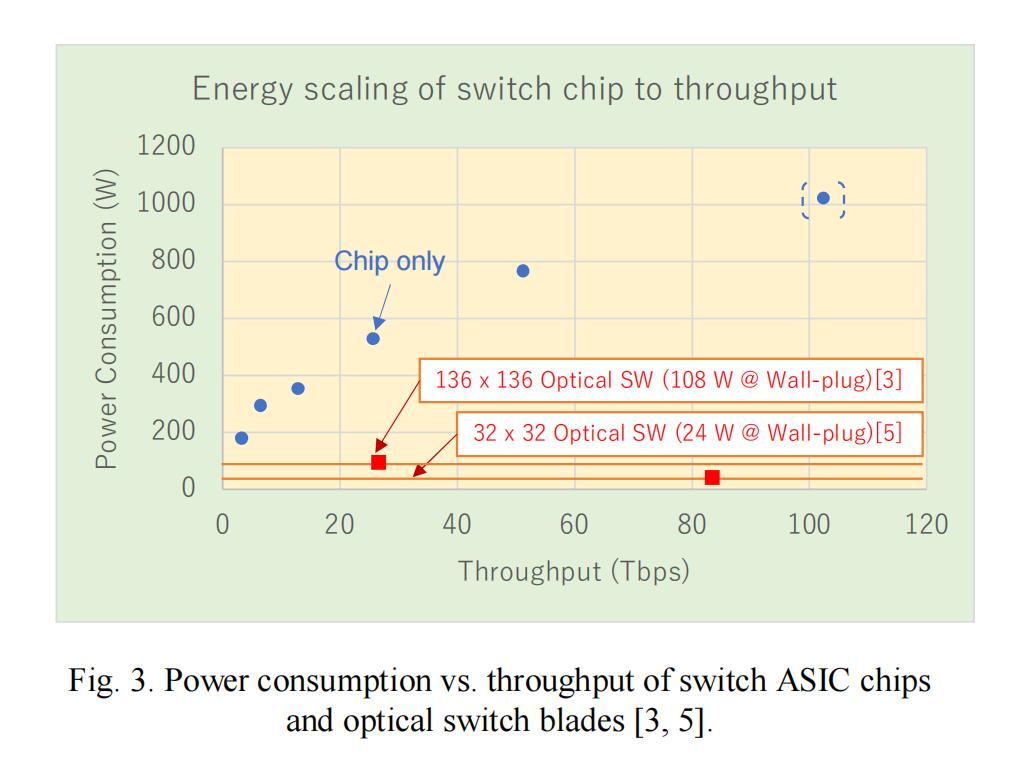 事实上,ASIC交换机的功耗会随着吞吐量的增加而增加,在100Tbps吞吐量下,每个芯片的功耗会超过1000W;而光交换机的功耗则极低且在吞吐量增加的情况下保持稳定(图3)。因此,使用光交换机替代电交换机越多,系统效率就越高。以下将讨论一些实际问题。