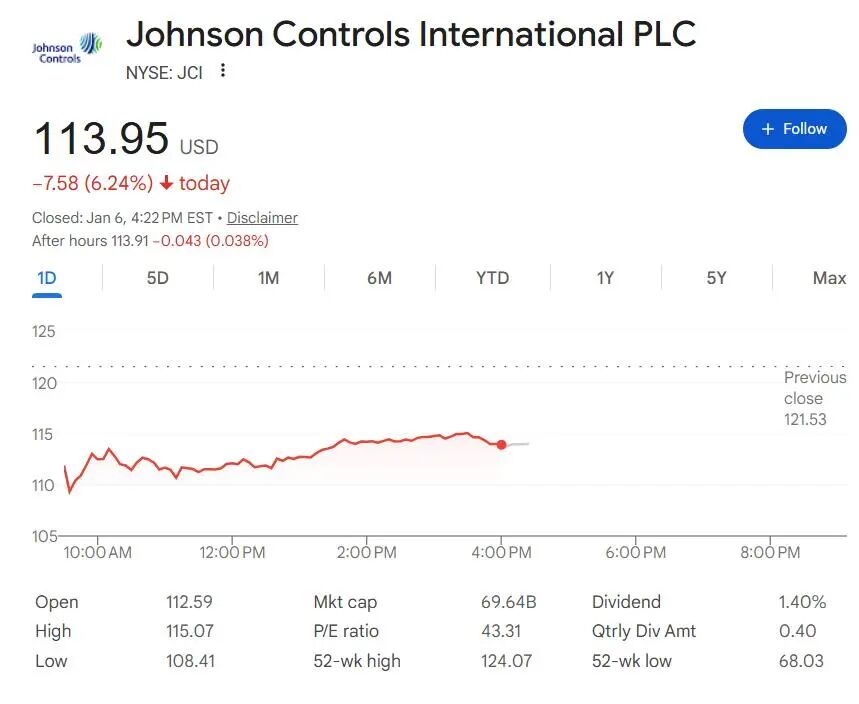 数据中心冷却系统制造商股价则遭遇重挫。江森自控(Johnson Controls)股价周二一度跌11%,收跌逾6.2%。Modine Manufacturing盘中曾跌21%,后收窄过半跌幅,收跌近7.5%,Trane Technologies和Carrier Global分别收跌2.5%和0.5%。