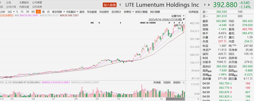 值得一提的是,美股光芯片概念股Lumentum也在近日创下了股价新高,近半年来股价涨超280%。