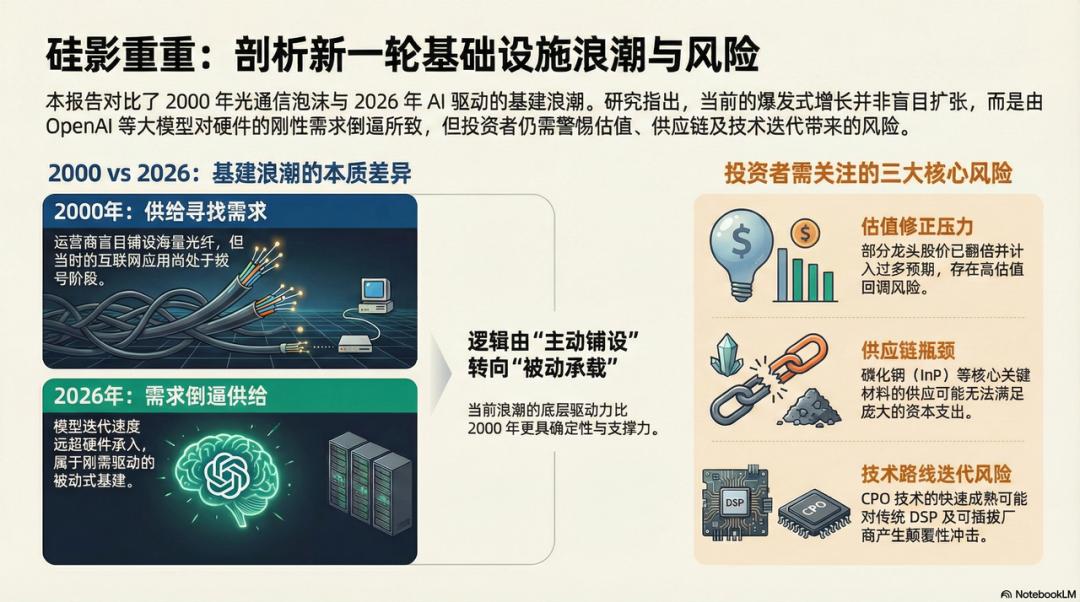 2000 年是“供给寻找需求”——运营商铺设了海量的光纤,却发现互联网应用还停留在拨号阶段;而 2026 年是“需求倒逼供给”——OpenAI、Google 的模型迭代速度远超硬件的承载能力。这是一种刚需驱动下的、被动式的基建浪潮。