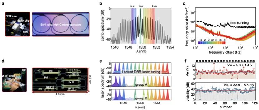 a 服务器端氮化硅微腔光频梳种子激光光源芯片 b 暗脉冲光频梳光谱 c 光频梳各梳齿的频率噪声功率谱密度 d 全集成的磷化铟QKD用户发送端芯片 e 用户端本地片上激光器的波长调谐范围 f 用户端片上调制器半波电压与调制深度