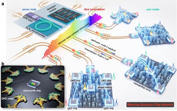 a 双场量子密钥分发芯片网络架构 b 20个QKD芯片和微梳光源芯片实物照片