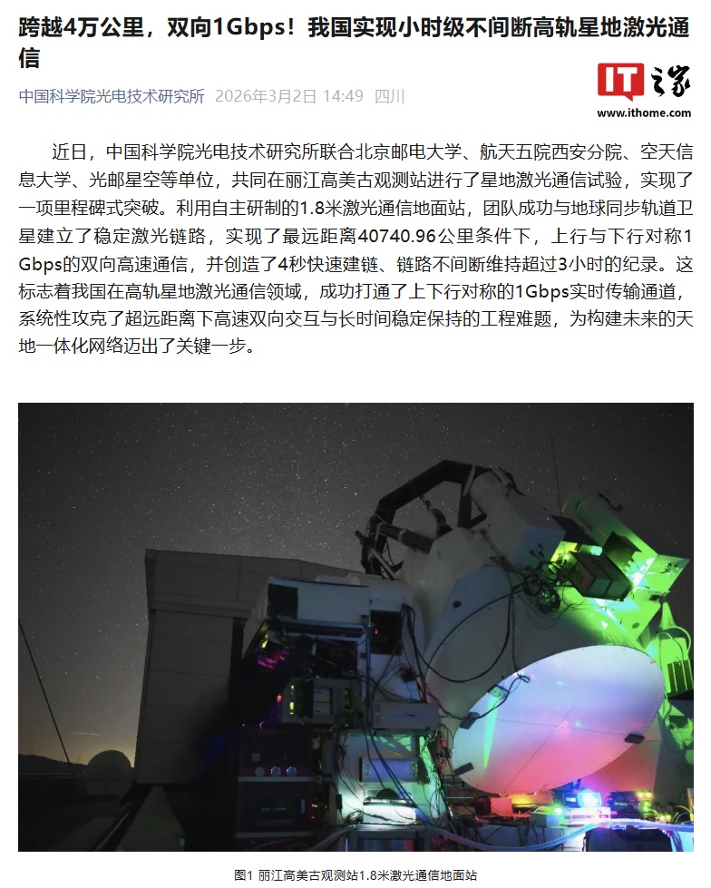 IT之家 3 月 4 日消息,据中国科学院光电技术研究所公众号消息,近日,中国科学院光电技术研究所联合北京邮电大学、航天五院西安分院、空天信息大学、光邮星空等单位,共同在丽江高美古观测站进行了星地激光通信试验,实现了一项里程碑式突破。