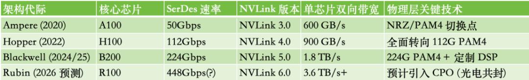 以英伟达为例,其GPU之间的高速互联依赖自研的 NVLink。NVLink 的代际演进,本质上是 SerDes 速率升级与链路规模扩展的双重推进:一方面通过提升单条 SerDes 的传输速率,另一方面通过增加链路数量和优化互联拓扑,从而实现系统带宽的指数级提升。从 Ampere 架构到 Blackwell 架构,NVLink 所依赖的 SerDes 技术已经从 约 56Gbps 级别演进至 224Gbps 级别,使得单颗 GPU 的互联带宽实现跨代跃升。这种持续提升的高速互联能力,使 NVLink 成为英伟达 GPU 生态的重要护城河,也构成了其 AI 集群架构的核心优势。