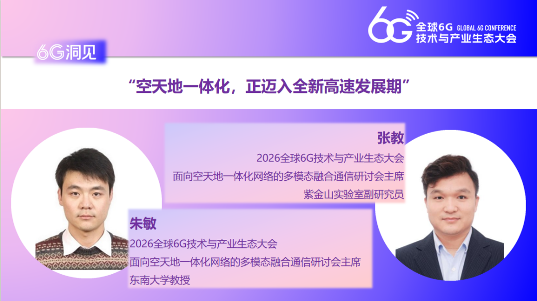 大会前夕,2026全球6G技术与产业生态大会“面向空天地一体化网络的多模态融合通信研讨会”两位主席,东南大学教授朱敏和紫金山实验室副研究员张教,参与了【6G洞见】访谈。他们提到,空天地一体化多模态融合通信技术的成熟,是6G实现全域无缝覆盖、高速高可靠连接的关键支撑,目前国内高校与科研机构对太赫兹通信的研究正稳步推进,重点围绕器件与阵列、太赫兹天线前端、小型化收发链路、高频信号处理、星载 / 空基平台兼容性等方向展开攻关。