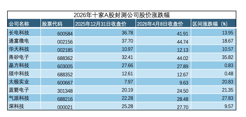 在具体公司层面,十家A股封测企业的股价走势呈现出鲜明的分化格局。