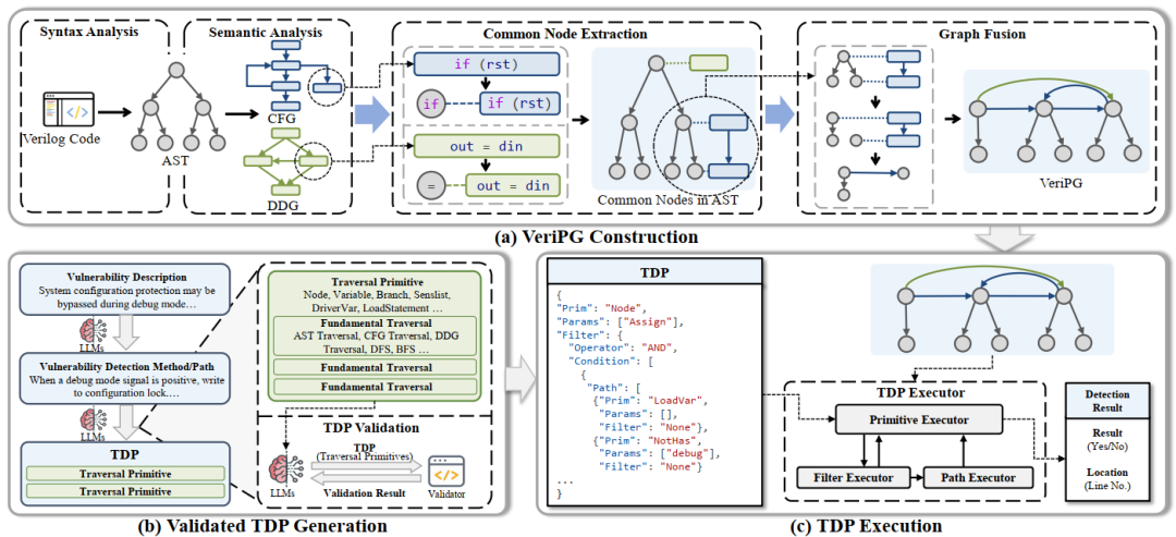 本文提出了一种LLM辅助的Verilog漏洞检测框架VerilogLAVD。首先设计了统一Verilog属性图(VeriPG),通过融合抽象语法树(AST)、控制流图(CFG)和数据依赖图(DDG)显式建模硬件并行语义;进而设计了语义验证机制,对LLM生成的可执行遍历检测模式(TDP)进行约束与过滤;最终在VeriPG上执行验证后的TDP,输出稳定的检测结果。与纯LLM方法相比,本文方案F1分数提升了0.31,并成功在开源硬件设计仓库中发现真实安全漏洞。