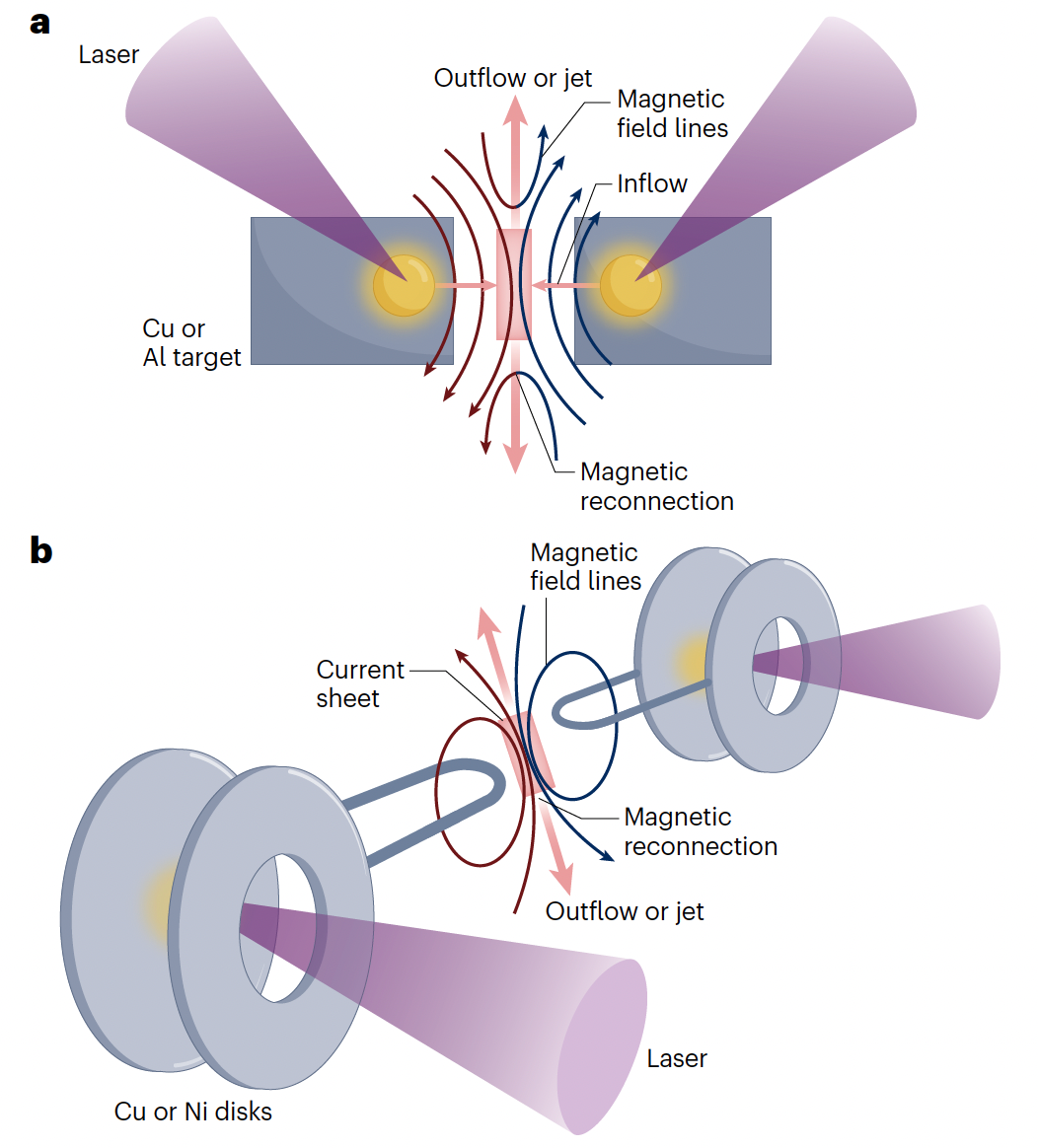激光驱动的等离子体磁场重联传统磁场研究主要依赖天文观测和理论模拟,而强激光产生的等离子体为解决这些难题提供了全新途径。某些天体环境的极端条件(如高温、高压、高密度)可在实验室中被精准再现,成为研究天体磁场的“新途径”。本论文系统阐述了激光等离子体在天体磁场研究中的核心应用,包括: