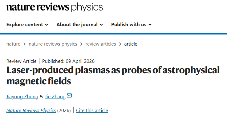 近日,上海交通大学李政道研究所、暗物质物理全国重点实验室张杰院士与北京师范大学文理学院仲佳勇教授合作,在国际权威综述期刊《Nature Reviews Physics》(2024年影响因子39.5,五年影响因子53.2)在线发表题为“Laser-produced plasmas as probes of astrophysical magnetic fields”的综述论文。文章系统梳理了天体磁场的产生、放大、输运、耗散以及对天体等离子体约束等关键物理过程,深入阐述了强激光产生等离子体在模拟天体极端环境、研究上述天体磁场物理特性方面的核心价值。
