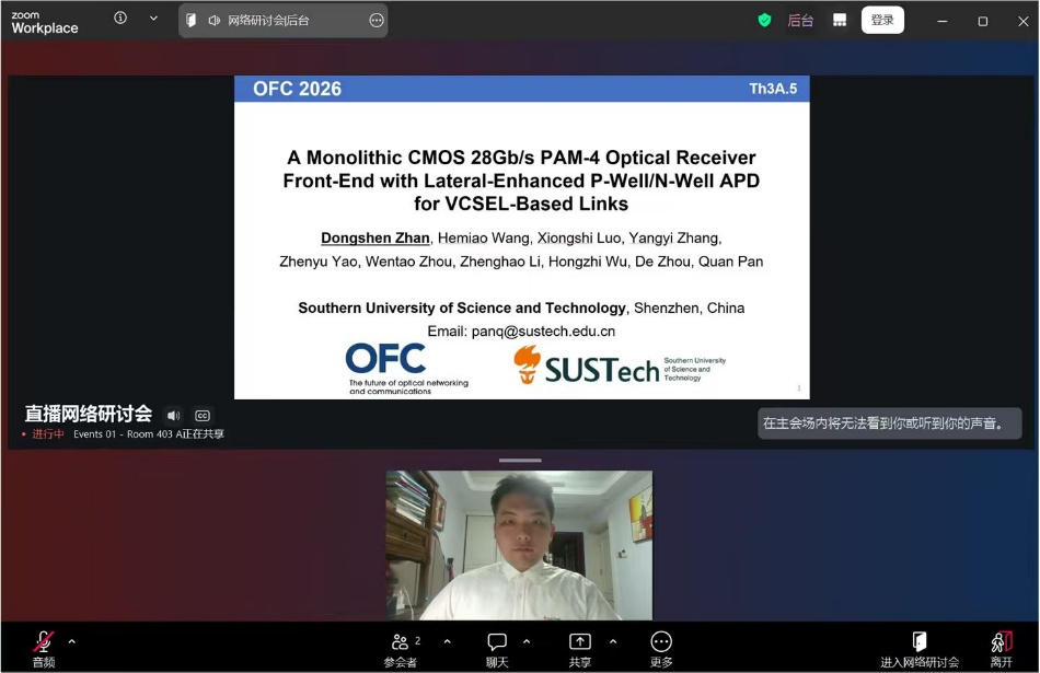 OFC每篇论文都代表着当前光通信领域最重要的发展方向。南方科技大学微电子学院潘权课题组今年有1篇论文入选,标题为:A Monolithic CMOS 28Gb/s PAM-4 Optical Receiver Front-End with Lateral-Enhanced P-Well/N-Well APD for VCSEL-Based Links。该工作被评选为高分论文(Top-Scored),并受到光波技术杂志期刊(Journal of Lightwave Technology,JLT)的邀稿。
