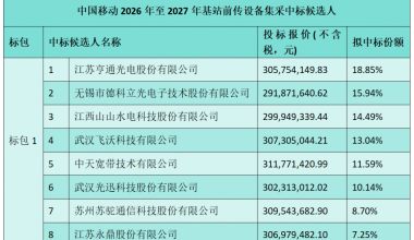 中国移动58万套基站前传设备集采:亨通光电等八家中标